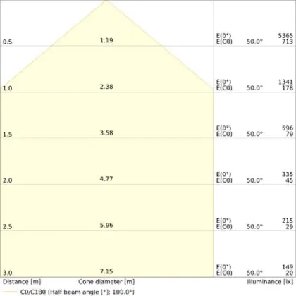 De gradenbundel geeft informatie over hoe breed het licht wordt uitgestraald. Dit zit tussen de 0 en 360 graden (D). Hoe kleiner de hoek, hoe specifieker de lichtbundel is. Over het algemeen is een smalle gradenbundel perfect voor sfeer- of accentverlichting, terwijl een brede gradenbundel ideaal is om grote oppervlaktes te verlichten.